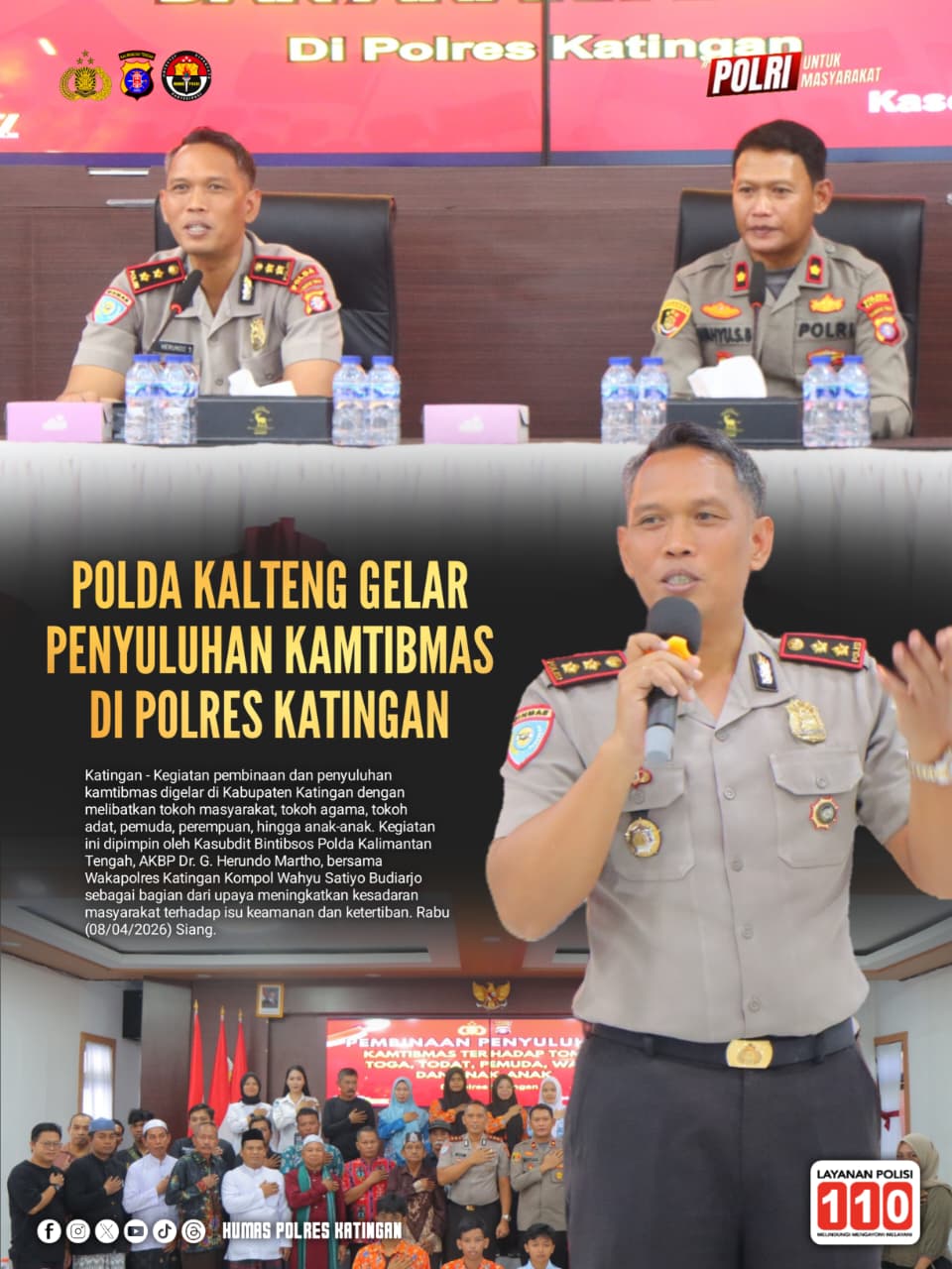 Katingan – Kegiatan pembinaan dan penyuluhan kamtibmas digelar di Kabupaten Katingan dengan melibatkan tokoh masyarakat, tokoh agama, tokoh adat, pemuda, perempuan, hingga anak-anak. Kegiatan ini dipimpin oleh Kasubdit Bintibsos Polda Kalimantan Tengah, AKBP Dr. G. Herundo Martho, bersama Wakapolres Katingan Kompol Wahyu Satiyo Budiarjo sebagai bagian dari upaya meningkatkan kesadaran masyarakat terhadap isu keamanan dan ketertiban. Rabu (08/04/2026) Siang.